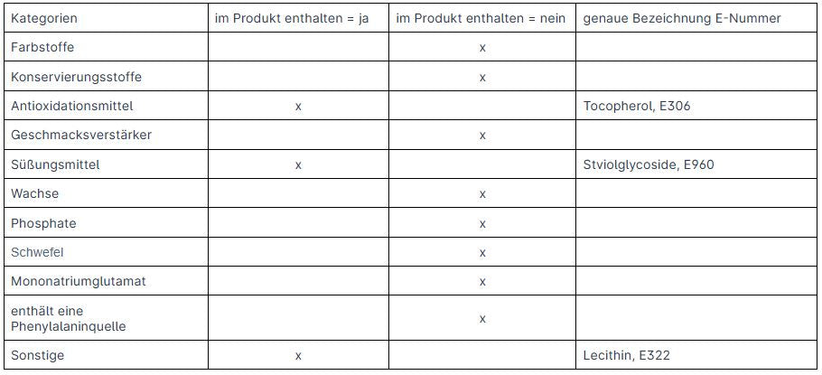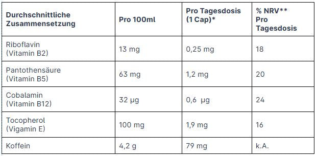 MCT oil: 100% vegetable oil (medium-chain triglycerides from palm and coconut fat/rapeseed oil in varying proportions), emulsifier lecithin (from soy), grape seed oil, natural caffeine (from coffee beans), orange oil, ginger extract, guarana extract, green tea extract, ginseng extract, sweetener steviol glycosides, 100% natural vitamin E from mixed natural tocopherols* (D-alpha-tocopherol, D-beta-tocopherol, D-gamma-tocopherol and D-delta-tocopherol), calcium D-pantothenate, riboflavin, cyanocobalamin.